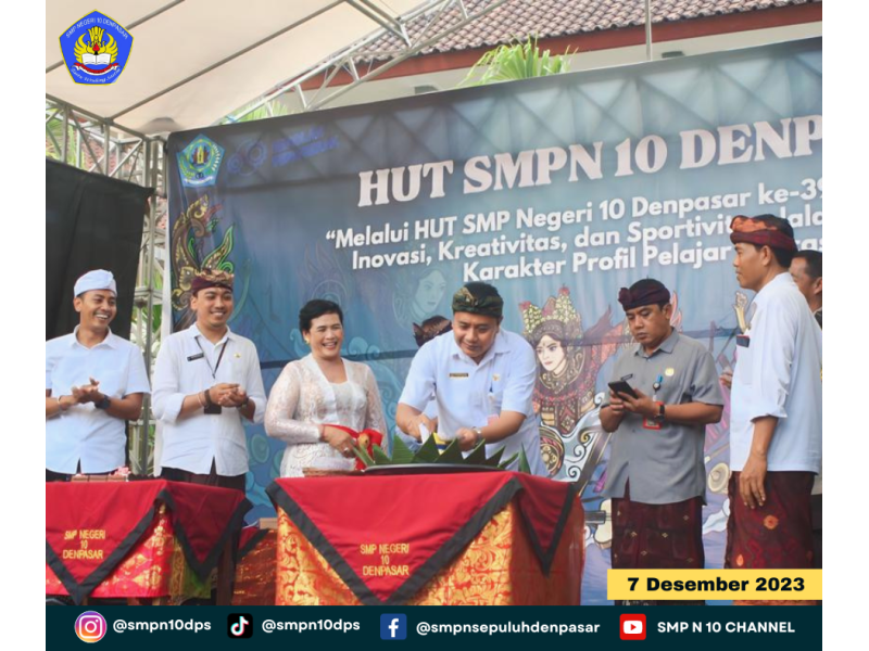 SelengkapnyaKamis, 7 Desember 2023 SMP Negeri 10 Denpasar merayakan hari ulang tahun (HUT) yang ke-39. Puncak HUT dimeriahkan dengan pemotongan tumpeng oleh Kepala SMP Negeri 10 Denpasar, I Wayan Sumiara,S.Pd., M.Pd didampingi oleh Kepala Dinas ...