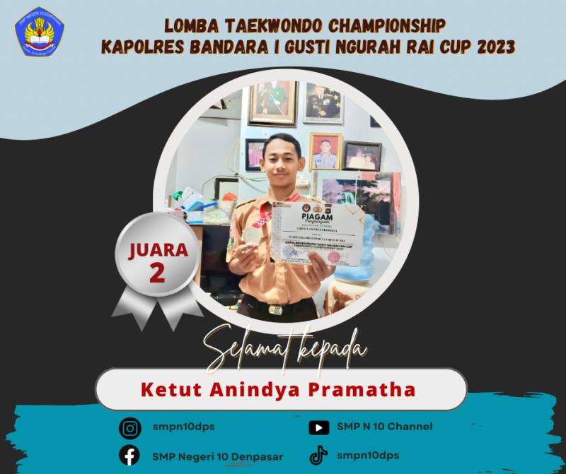 Selamat kepada Ketut Anindya Pramatha meraih juara 2 taekwondo tingkat lomba pemula dalam ajang “Kapolres Bandara I Gusti Ngurah Rai Cup 2023” yang dilaksanakan pada tanggal 3 September 2023 di Lippo Mall Kuta, Bali.