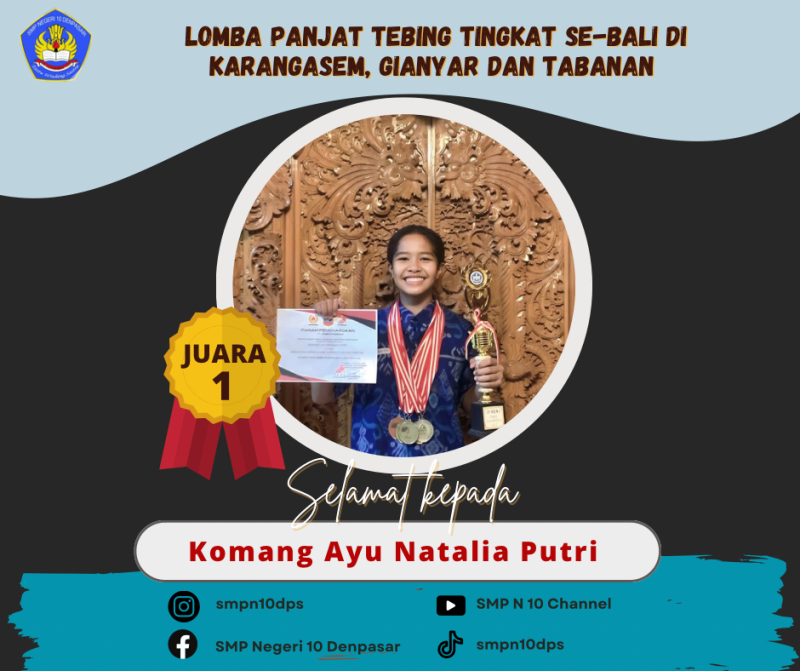 Selamat kepada Komang Ayu Natalia Putri kelas VII I, telah meraih juara 1 lomba panjat tebing putri se-Bali di kabupaten Karangasem, Gianyar dan Tabanan