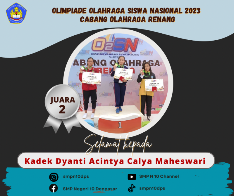 Selamat kepada Kadek Dyanti Acintya Calya Maheswari kelas VIII A, meraih juara 2 dalam ajang Olimpiade Olahraga Siswa Nasional 2023 Cabang Olahraga Renang